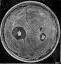 Рис. 1. Синергізм у мікробів. Навколо агарового блоку з культурою актиномпцета видна зона стимуляції росту цвілевого гриба.