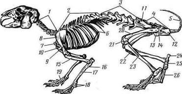 шейные позвонки, 2—грудные позвонки, 3—поясничные позвонки, 4—крестец, 5 — хвостовые позвонки, 6— ребра, 7 — рукоятка грудины, 8 —лопатка, 9 — акромиаль-ный отросток лопатки, 10—коракоидный отросток лопатки, //—подвздошный отдел безымянной кости, 12 — седалищный отдел той же кости,. 13 — лобковый отдел той же кости, 14—запирательное. отверстие, 15—плечевая кость, 16—локтевая кость, 17— лучевая кость, 18 — запястье, 19 — пясть, 20 — бедро, ЗУ—коленная чашечка, 22— большая берцовая кость, 23— малая берцовая кость, 24— пяточная кость, 25—таранная кость, 26 — плюсна