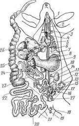 матка, 16—мочеточник, 17—влагалище, 18 — половое отверстие, 19 — заднепроходное отверстие, 30 — прямая кишка,. 21 — селезенка, 22 — толстая кишка, 23 — тонкая кишка, 24 — поджелудочная железа, 25 — слепая кишка, 26 — печень, 27 — мочеполовой синус
