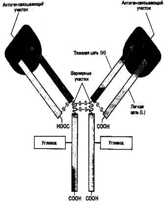 Основную структурную единицу молекулы антитела образуют четыре полипептидные цепи – две идентичные легкие (L-цепи, каждая примерно из 220 аминокислот) и две идентичные тяжелые (Н-цепи, каждая примерно из 440 аминокислот). Все четыре цепи соединены между собой с помощью нековалентных взаимодействий и ковалентных связей (дисульфидных мостиков). Молекула состоит из двух одинаковых половинок, в которых L- и Н-цепи вносят почти равный вклад в построение двух идентичных антиген-связывающих участков (рис. 3).