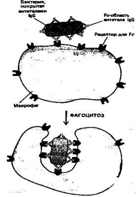 IgG-антитела составляют основной класс иммуноглобулинов, находящийся в крови. Они производятся в больших количествах при вторичномиммунном ответе. Fc-область молекул IgG связывается со специфическими рецепторами фагоцитирующих клеток, таких как макрофаги и полиморфноядерные лейкоциты, и в результате эти клетки могут более эффективно поглощать и разрушать внедрившиеся микроорганизмы, покрытые IgG-антителами (рис. 6).