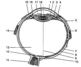 Рис. 1 - Схема будови очного яблука:1 - рогівка; 2 - райдужка; 3 - війкова зв'язка; 4 - війкове тіло; 5 - склера; 6 - прямий бічний м'яз; 7 - власне судинна оболонка; 8 - сітківка; 9- зорова вісь очного яблука; 10 - центральна ямка на жовтій плямі; 11 - зоровий нерв; 12 - диск зорового нерва; 13 - склисте тіло; 14 - прямий медіальний м'яз; 15 - кон'юнктива очного яблука; 16 - задня камера ока; 17 - передня камера ока; 18 - кришталик