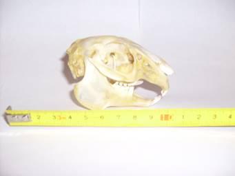 Череп с относительно узкой и слабо вздутой мозговой капсулой. Отношение ширины лобных костей позади надглазничных отростков к ширине основания рострума составляет от 51 до 57% (в среднем -53%). Длина костного нёба равна или несколько больше ширины хоан. Альвеолярная длина верхнего зубного ряда 16,6 - 18,5 мм (в среднем -17,5 мм). Скуловые дуги массивные, широко расставленные - скуловая ширина в передней части 37,1- 44,6 мм (в среднем – 40,0 мм). Надглазничные отростки узкие и короткие – не достигают заднего края лобных костей. Нижняя челюсть короткая, массивная. Длина нижней диастемы по отношению к длине нижнего ряда зубов составляет 80%.