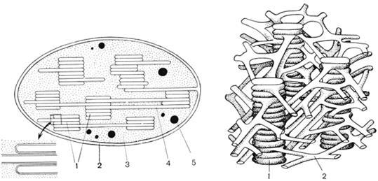 Строение хлоропласта. Слева — продольный разрез через хлоропласт. Участок внизу показан в увеличенном виде: 1 — граны, образованные ламеллами, сложенными стопками; 2 — оболочка; 3 — строма (матрикс); 4 — ламеллы; 5 — капли жира, образовавшегося в хлоропласте. Справа — трехмерная схема расположения и взаимосвязи ламелл и гран внутри хлоропласта: 1 — граны; 2 — ламеллы.