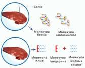 Расщепление жиров на глицерин и жирные кислоты осуществляется ферментами - липазами. Белки вначале расщепляются до олигопептидов, а затем до аминокислот.