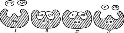Расходование и генерирование АТФ: І — освобождение энергии, ІІ — преобразование энергии и совершаемая работа
