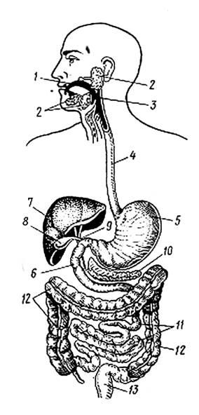 Травний апарат людини складається з таких органів: ротова порожнина ротовий отвір, язик, зуби, жувальні м'язи, слинні залози, залози слизової оболонки порожнини рота), глотка, стравохід, шлунок, дванадцятипала кишка, підшлункова залоза, печінка, тонкі і товсті кишки, пряма кишка (рис.1). Усі травні органи складаються з трьох оболонок: