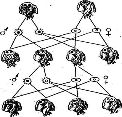 он наблюдал следующее расщепление: 315 желтых гладких, 101 желтых морщинистых, 108 зеленых гладких и 32 зеленых морщинистых. Используя другие гомозиготные родительские формы (желтые морщинистые и зеленые гладкие), Мендель получил аналогичные результаты и в первом, и во втором поколениях гибридов, т. е. расщепление во втором поколении в отношении 9: 3 : 3 : 1 (Приложение 3).