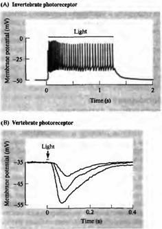 Рецепторы в основном отвечают на соответствующий стимул путем локальной деполяризации переменной амплитуды, которая может вызвать в дальнейшем потенциал действия. И хотя у большинства беспозвоночных фоторецепторы воспринимают свет подобным образом (рис.5А), восприятие света рецепторными клетками у большинства позвоночных происходит по-другому. На рис.5В показаны сигналы, отведенные от палочки черепахи при помощи внутриклеточного электрода. В темноте (во время отдыха) фоторецепторы деполяризуются постоянным входящим током в области наружного сегмента ("темновой ток"). Свет приводит к гиперполяризации, уменьшая величину входящего тока. В следующих абзацах будет рассказано, каким образом свет поглощается фоторецепторами и какие механизмы вызывают электрические сигналы, показанные на рис. 5.