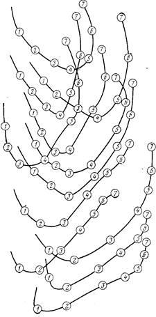 Основные типы структуры стаи пелагических рыб доказаны на схеме. Большое внимание Радаков уделил механизмам согласованности (или организованности) действий рыб в стае, что представляет интерес особенно в связи с отсутствием постоянных вожаков в стае рыб. В этом отношении стаю рыб, говоря языком кибернетики, следует рассматривать, как пример самоуправляемой системы без центрального управления. Опыты Радакова над некоторыми видами стайных рыб подтвердили вывод о том, что в стаях большинства рыб постоянные вожаки отсутствуют. При этом рыбы, идущие в головной части стаи, постоянно заменяются новыми из основной массы данной стаи. Расшифровка кадров киносъемки движущихся стай в экспериментальных бассейнах показала, как рыбы, движущиеся в головной части, даже при прямолинейном движении, постепенно отстают и оказываются в середине стаи, а при повороте на 180 градусов передние начинают поворот, но в поворот включаются все особи и в результате идущие в задней части оказываются впереди (см. рис.). Эти эксперименты также показали, что роль «вожака» на каждый данный момент выполняет достаточно большая по численности часть стаи. Так, для молоди сельди и карповых рыб было доказано, что изменение поведения и движения всей стаи определялось соответствующим изменением части стаи в том случае, если эта часть по своей численности составляла не менее 30— 40% от общего количества особей стаи. Сигнализация в данном случае заключается в передаче особенностей поведения и скорости движения определенной части стаи, выполняющей в этот момент функцию инициатора поведенческой реакции, остальным членам стаи.