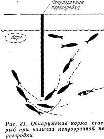 Значение стаи (пли вообще группирования) животных при питании также довольно разнообразно. Прежде всего, в группах животные легче находят скопления пищи. Как показали опыты, проведенные с молодью сайды, та часть рыб из стаи, которая обнаружила корм и бросалась к нему, увлекала за собой других рыб стаи, которые не могли видеть корма (он был от этих рыб скрыт непрозрачной перегородкой), а те в свою очередь увлекали еще более отдаленных сочленов стаи (См. рис3.1) . Таким образом, стадность облегчала рыбе поиск пищи, и в считанные секунды вся стая собиралась на скоплении кормовых организмов, обнаруженных лишь частью ее сочленов.
