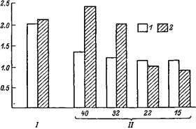 Влияние приспособления организма к повышенной мышечной деятельности на функциональное состояние митохондрий мышечных волокон (величина коэффициента Р/О — по оси ординат) в различных температурных условиях (по оси абсцисс), I — покой при оптимальной температуре; // — плавание 15 мин при разной температуре воды,0