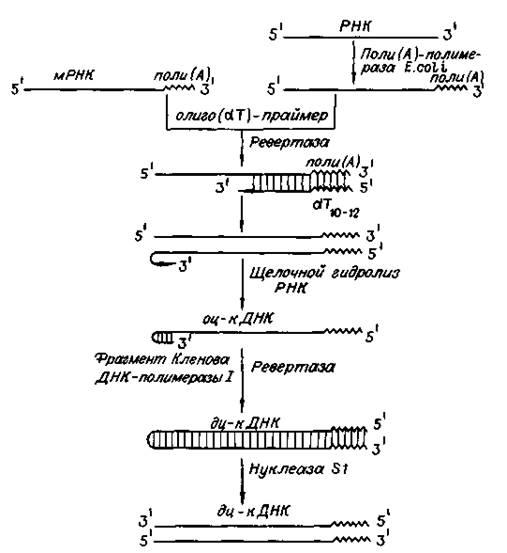 Обратную транскриптазу преимущественно используют для транскрипции матричной РНК в комплементарную ДНК (кДНК). Реакцию обратной транскрипции проводят в специально подобранных условиях с использованием сильных ингибиторов РНКазной активности. При этом удается получать полноразмерные ДНК-копии целевых молекул РНК. В качестве праймера при обратной транскрипции поли (А)-содержащих мРНК используют олигo (dT), а для молекул РНК, не имеющих З'-поли (А) концов, — химически синтезированные олигонуклеотиды, комплементарные З'-концу изучаемой РНК. После синтеза на мРНК комплементарной цепи ДНК и разрушения РНК (обычно применяют обработку щелочью) осуществляют синтез второй цепи ДНК. При этом используют способность ревертазы образовывать на 3'-концах одноцепочечных кДНК самокомплементарные шпильки, которые могут выполнять функции праймера.