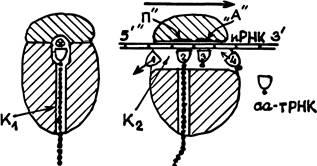 Левая схема — разрез рибосомы плоскостью, перпендикулярной к иРНК, проходящей через вертикальный канал Кр иРНК здесь изображена маленьким кружком с перекрестием. На правом разрезе она видна, как узкая полоска, где кодоны отмечены черточками. Это — разрез плоскостью, проходящей через иРНК и оба канала. Из сопоставления разрезов видно, что горизонтальный канал имеет вытянутое вниз сечение. Вертикальный канал — круглый. Пронумерованные половинки эллипсов изображают молекулы тРНК. Их прямолинейные участки — антикодоны. Черная точка у вершины полуэллипса — аминокислота. Цепочка черных точек, выходящая из Ki — новосинтезированный фрагмент белка. Нижняя точка на этой цепочке — метионин, с которого начинался синтез белка.