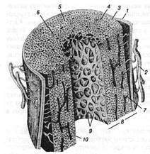 1 — окістя; 2 — кровоносні судини; 3 — зовнішня загальна система кісткових пластинок; 4 — остеон; 5 — вставна система; 6 — канал остеона; 7 — фолькманівський канал; 8 — компактна кістка; 9 — губчаста кістка; 10 — внутрішня загальна система кісткових пластинок