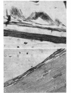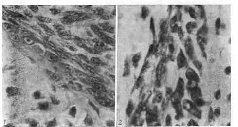 Рис. 5. Періост області завороту хрящового епіфіза і метафиза стегнової кістки жаби. Між хрящовим епіфізом і кісткою розташовуються скелетогенные клітини (гематоксилін Делафильда - еозин; про. 60; ок. 7).