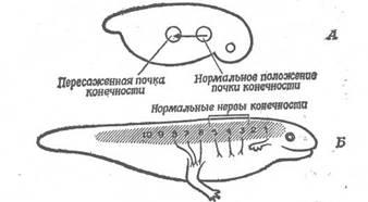 Як показано на рис. 6, передня кінцівка амфібій у нормі інервується нервами, що йдуть з 3-5-го сегментів спинного мозку. Якщо до початку росту нервів зачаток кінцівки пересадити назад, помістивши його проти 5-7-го сегментів, то нерви, що йдуть від 3-5-го сегментів, відхиляються від свого звичайного шляху, повертають назад і іннервують пересаджену кінцівку (рис. 6). Якщо зачаток кінцівки пересадити ще далі назад, проти 6- 8-го сегментів, то кінцівка інервується нервами, що йдуть з 6-8-го сегментів (рис. 7). Отже, існує межа для відстані, на яке можуть відхилитися нерви нормальної кінцівки, щоб урослися в пересаджену кінцівку.