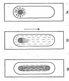 А. Культура нейробластів у неорієнтованому середовищі. Нервові волокна ростуть у всіх напрямках. Б. Середовище орієнтоване шляхом розтягування, після чого нервові волокна ростуть паралельно один одному. В. Дві культури орієнтують середовище, що знаходиться між ними, і нервові волокна ростуть паралельно один одному.