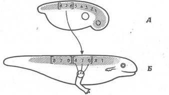 Рис. 10. Заміна 6-, 7- і 8-го сегментів спинного мозку 3-, 4- і 5-м сегментами. Зачаток передньої кінцівки залишається в колишнім положенні. Кінцівка, що розвивається, притягає нерпи з пересаджених 6-, 7- і 8-го сегментів і нормально функціонує. Отже, нове середовище викликало розвиток 6-, 7- і 8-го сегментів по типу 3-, 4- і 5-го сегментів. А. Пересадження 6- 7- і 8-го сегментів на місце 3-, 4- і 5-го. Б. Пересаджені сегменти нормально функціонують.