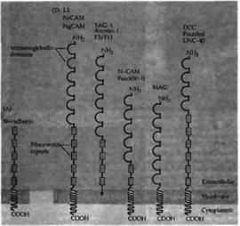 Молекулы клеточной адгезии управляют ростом аксона, обеспечивая наиболее благоприятное окружение для вытягивания конуса роста. Клеточные молекулы адгезии представляют собой трансмембранные или связанные с мембраной гликопротеины, характеризующиеся структурными мотивами своих внеклеточных частей, которые во многом гомологичны постоянным доменам иммуноглобулинов и фибронектина 3 типа (рис.2). Представителями надсемейства этих иммуноглобулинов (Ig) являются клеточные молекулы адгезии (N-CAM), молекулы адгезии нейроглии САМ (NgCAM), TAG-1, MAG, и DCC83)