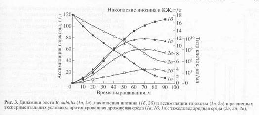 со стандартной на дейтерированную среду в целом изменяются незначительно. Как видно из рис.3, при росте штамма на среде, содержащей обычную воду уровень накопления инозина в культуральной жидкости достигал величины 18,3 г/л после пяти суток культивирования. Вместе с тем, биосинтез инозина на dFМ-среде, был снижен в 4,6 раз по-сравнению с исходным штаммом на протонированной среде (рис.3). Такие низкие уровни секреции инозина на dFM-cреде коррелируют со степенью конверсии глюкозы в этих условиях. Как видно из рис.3, кривая конверсии глюкозы на полностью дейтерированной среде имеет меньший угол наклона, чем на среде с обычной водой, что свидетельствует о том, что при росте на 2