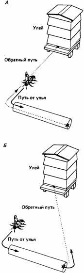 Когда пчела вылетает из улья в поисках новых источников пищи, она совершает полет по извилистой траектории, посещая различные возможные участки для сбора пищи. В улей же она летит по прямой, не повторяя маршрута пройденного пути. Было высказано предположение, что пчела сохраняет в памяти картину каждого звена своего "изломанного" пути, измеряя длину этого звена по затраченной энергии, а направление этого звена - по величине угла, который оно составляет по отношению к ориентирам на местности и к солнцу.