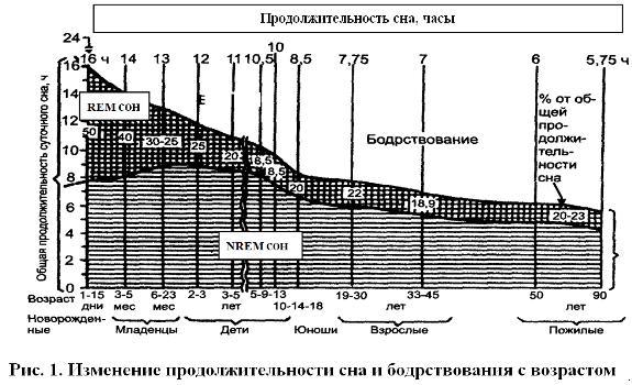 Структура сна у детей и подростков. Самое выраженное возрастно-зависимое отличие в структуре сна выявлено у новорожденных детей. На рис. 1 видно, что общая продолжительность сна в онтогенезе человека постепенно уменьшается, наиболее быстро – от периода новорожденности к подростковому возрасту. С возрастом латентный период сна удлиняется (наиболее выражено у людей старше 70 лет) и число пробуждений у них значительно увеличивается. Однако и у здоровых детей грудного возраста сон может прерываться внезапными вздрагиваниями, движениями рук, часто пугающими детей. Кроме того, в генезе беспокойного сна детей первых месяцев жизни свою роль играет функциональная незрелость пищеварительного тракта, повышенное газообразование в кишечнике и связанные с этим колики.