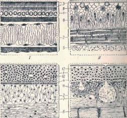В индивидуальном развитии первичный кожный покров — слой эктодермы − дает наружный слой кожи, т. е. эпидермис со всеми его производными (пигмент, органы чувств, железы и роговой слой). Собственно кожа, или кориум,— соединительно-тканый слой кожных покровов — развивается за счет мезодермы от кожного листка миотома. Первичным строением кожи можно считать однослойный эпидермис и кориум, состоящий из неоформленной студенистой ткани. Такой кожный покров имеется у ланцетника и у зародышей позвоночных (рис. 1). У асцидий и сальп − кожные покровы срастаются со стенкой тела в общий слой — мантию, а на поверхности тела выделяется особый, содержащий клетчатку покров — туника. Уже начиная с круглоротых и у всех первичноводных позвоночных (бесчелюстных) и у всех рыб (и даже частично у земноводных), строение кожи характеризуется следующими общими чертами: