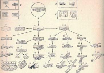 1а-1д — ряд стадий дентинообразовання у акуловых рыб при развитии плакоидных чешуи с типичным эмалевым органом, 2а — 2г — развитие костных зубчиков (2а~2б), спинных жучек и бляшек (2в—2г) в коже осетровых рыб с выпадением дентинообразоаания. За—Зв— развитие циклоидных чешуи в коже костистых рыб при полной рудиментации эмалевого органа, 4 — схема ганоидной чешуи как пример комплекса многих генераций чешуи, 5 и 6 — замещение скелетообразующей функции кожи железистой функцией в коже рыб. 7—10 — общий зачаток роговых чешуи, перьев и волос у амниот. 7а— 7г — стадии развития роговых чешуи у рептилий и птиц, 8а —8г — развитие пухового пера и 8д — развитие контурного пера, 9а—9г — стадии развития полоса при полной рудиментации соединительнотканого сосочка и прогрессивного развития эпидермального зачатка, 10а—10б − восстановление роговых чешуи в коже млекопитающих