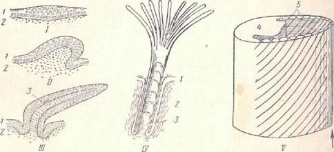 Рис. 6. Схема развития пера (по Гессе). /, // и /// —продольные разрезы через зачатки пера разного возраста; IV—эмбриональное перо в разрезе; V— стереограмма развивающегося контурного пера: