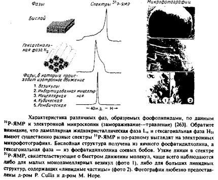 Р-ЯМР, резко отличающиеся от спектров фосфолипидов в ламеллярной фазе. С помощью этого метода исследовался переход ламеллярной фазы в гексагональную в липидах и липидных смесях. Недостатком метода является некоторая неопределенность при интерпретации спектров в случае изотропного усреднения за счет относительно быстрых движений. Полагают, что такой спектр отвечает структурам типа «липидных частиц», однако это объяснение не является единственно возможным. Как было показано, метод 31