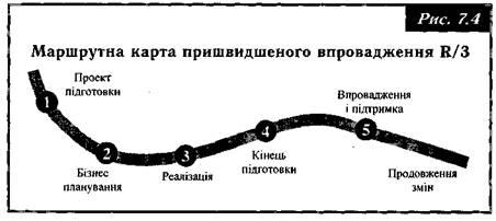 1. маршрутна карта (Roadmap) – визначає послідовність дій впровадження R/3, пропонуючи клієнтам пояснення на усіх фазах проекту та супроводжуючи їх на всіх етапах впровадження (рис. 6);