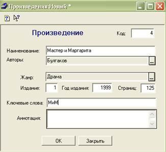 3. Справочник "Произведение": у каждого произведения есть уникальный код.
