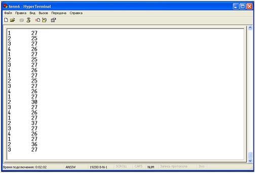 Содержимое буфера передачи данных отображается на экране ,с помощью программы Hiper Terminal.