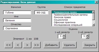С помощью этого окна можно изменять список студентов, их успеваемость по конкретному предмету, добавлять новые записи, удалять, а также просматривать уже имеющуюся информацию. Форма содержит следующие элементы управления: 8 элементов Label, 6 элементов TextBox, 1 элемент ListBox, 2 элемента SpinButton, 7 элементов CommandButton.