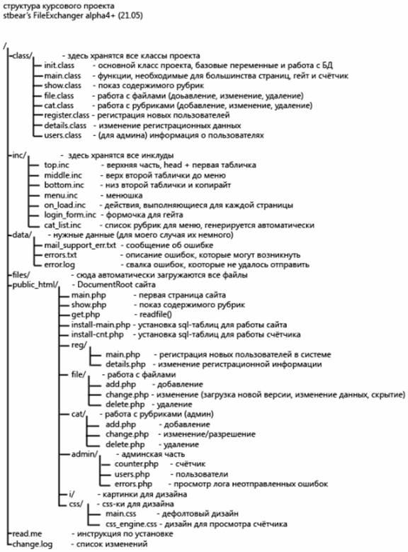 Глава 2 – инструкция программиста, в состав которой входят системные требования, инструкция по установке файлообменника, описание структуры проекта и подробное описание методов.