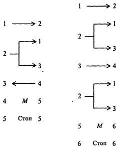 1. Пусть задано исходное состояние головки и требуется на пустой ленте написать две метки: одну в секцию под головкой, вторую справа от нее. Это можно сделать по следующей программе (справа от команды показан результат ее выполнения):