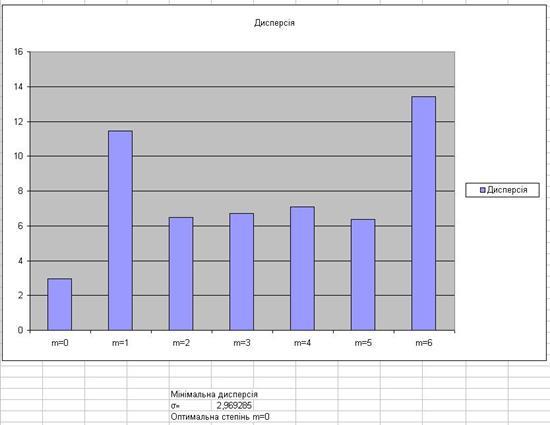 Вже по побудованій гістограмі можна робити висновки про оптимальність степені полінома для апроксимації вихідних даних (мінімальне значення , але визначимо мінімум за допомогою функції МИН(...) . І по отриманому значенню робимо висновок про оптимальну степінь апроксимуючої функції