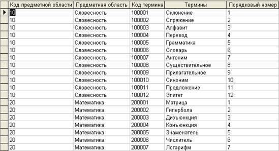 а) создать в таблице столбцы Порядковый номер, Термин, Код термина. Предметная область, Код предметной области;