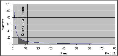 Воспользуемся первым законом Ципфа и построим график зависимости ранга от частоты. Исследования показывают, что наиболее значимые для текста слова лежат в средней части графика (рис. 1.3.). Этот факт имеет простое обоснование. Слова, которые попадаются слишком часто, в основном оказываются предлогами, местоимениями. Редко встречающиеся слова тоже, в большинстве случаев, не имеют решающего смыслового значения.