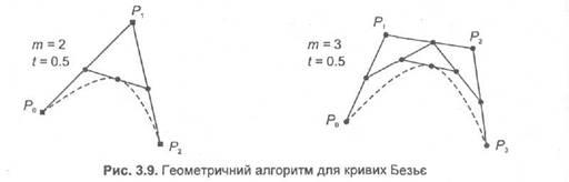 3. Сторони нового контуру знову діляться пропорційно значенню t. І так далі. Це продовжується до тих пір, доки не буде отримано єдину точку поділу. Та точка й буде точкою кривої Без'є (рис. 3.9).