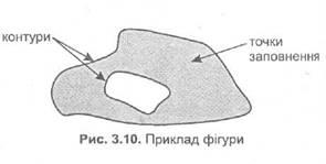 Фігурою тут будемо вважати плаский геометричний об'єкт, який складається з ліній контуру та точок, що містяться всередині контуру. Контурів може бути декілька — наприклад, коли об'єкт має всередині порожнини (рис. 3.10). У деяких графічних системах одним об'єктом може вважатися й більш складна багатоконтурна фігура — сукупність островів із порожнинами.