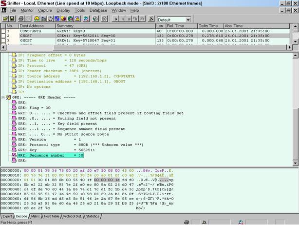 Для того чтобы просмотреть в каком виде передаются данные по протоколу PPTP использовался анализатор сети Sniffer Pro 2.5 (рисунок 57).