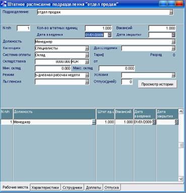 Закрываем окно, выбираем единицу бухгалтерия, нажимаем клавишу Enter. Получаем доступ к окну = Штатное расписание =. Окно имеет 3 панели. В верхней панели выбирается структурная единица ШР. В средней панели задаётся одна из строк ШР с подробным описанием как в анкетной форме. Нижняя панель содержит все строки ШР.
