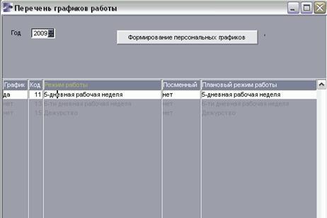 переходим к функции Графики работы. В окне = Перечень графиков работы = [ Приложение 12], исправляем год в поле Год верхней панели на 2009, в средней панели выбираем режим 5-дневная рабочая неделя, нажимаем клавишу Enter, на предложение сформировать график отвечаем Да, получаем окно = Формирование графика = [Приложение 13] . Выбираем шаблон 5-дневная рабочая неделя, проверяем наличие года и по кнопке Сформировать формируем график. С помощью кнопки Праздничные дни добавляем праздник 07/01/2009.