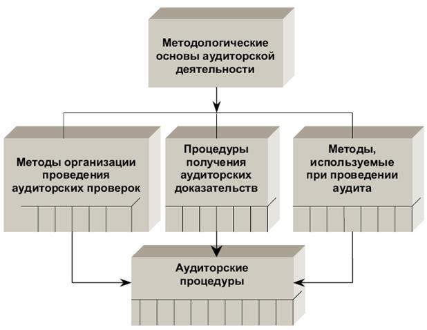 Как в среде практикующих аудиторов, так и среди научных работников принято считать, что методы аудита содержатся в стандартах аудиторской деятельности. Строго говоря, это не совсем так. Действительно, некоторые рекомендации о методах организации проведения аудита, сбора аудиторских доказательств содержатся в ряде российских стандартов аудиторской деятельности, таких как: «Аудиторские доказательства», «Аудиторская выборка», «Действия аудитора при выявлении искажений бухгалтерской отчетности», «Использование работы эксперта». Но методы организации проведения аудита, методы сбора аудиторских доказательств — это, строго говоря, не есть методы аудита. Нельзя считать методами аудита и аудиторские процедуры. Общая схема взаимосвязи методов и процедур, используемых в аудиторской деятельности, а также место в ней методов аудита представлены на рис. 1.