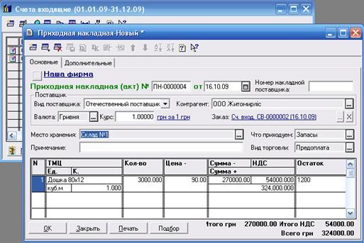 Для відображення в обліку операцій, пов'язаних із придбанням товарно-матеріальних цінностей у програмі передбачений документ «Приходная накладная». У тому випадку, коли за товар, що оприбутковується по накладній уже була зроблена передоплата по наданому нам постачальником рахунку, "Прибуткову накладну" варто вводити в режимі "Ввод на основании" даного рахунку. При цьому, у залежності тому, який документ був замовленням у такому ланцюжку - "Договор" або "Счет входящий", його найменування і реквізити будуть відображатися в поле «Заказ» електронної форми документа. При уведені "Приходной накладной" на підставі "Счета входящего" автоматично буде заповнена її таблична частина і реквізити шапки.