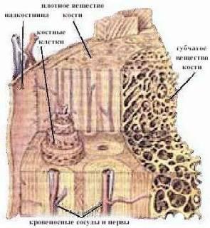 Костные клетки и их отростки окружены мельчайшими "канальцами", заполненными межклеточной жидкостью. Через межклеточную жидкость канальцев происходит питание и дыхание костных клеток.