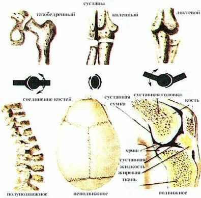 Подвижные соединения костей называют суставами, например бедренный, коленный, локтевой суставы. На одной из костей, сочленяющихся в суставе, обычно находится ямка - суставная впадина. В нее входит соответствующая ей по форме головка другой из сочленяющихся костей. Впадина и головка покрыты слоем блестящего гладкого хряща. Это облегчает скольжение головки во впадине при движениях в суставе.
