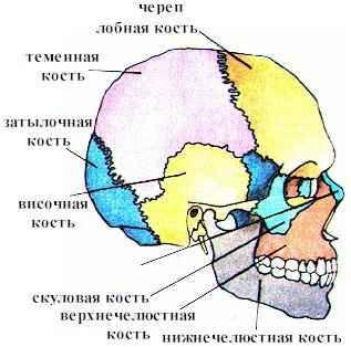Мозговой отдел черепа образован прочно и неподвижно соединенными между собой костями. Это парные теменные и височные, непарные лобная и затылочная кости. В височной кости имеется отверстие наружного слухового прохода. На нижней поверхности затылочной кости есть большое затылочное отверстие, через которое полость черепа соединяется с позвоночным каналом. Кости основания черепа пронизаны мелкими отверстиями. Через них проходят черепно-мозговые нервы и кровеносные сосуды.